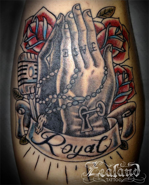 The roses represent his Mum, Dad and my wife. The microphone is his career and the praying hands are a “Shout out to the man upstairs for keeping us safe.” as he puts it.